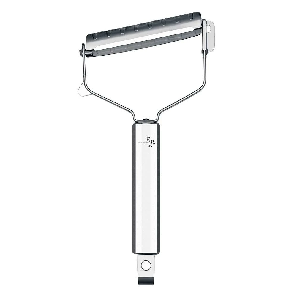 De T-peeler beschikt over een dik mes, dat onder een hoek van 10 graden is gemonteerd. Deze hoek en de buitengewone breedte van het mes staan garant voor uitzonderlijke schileigenschappen.
