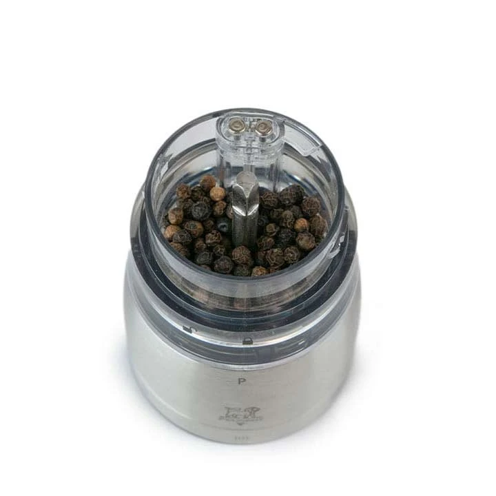 Elegant en compact. Deze elektrische, 16 cm grote pepermolen met u'Select kreeg een schitterende afwerking in iriserend zwart die perfect bij de roestvrijstalen onderkant past. De elegante molen is bijzonder praktisch dankzij de knop bovenaan, waarmee je de maalgraad met de grootste precisie afstelt. Zijn moderne en compacte design past harmonieus in elke keuken.