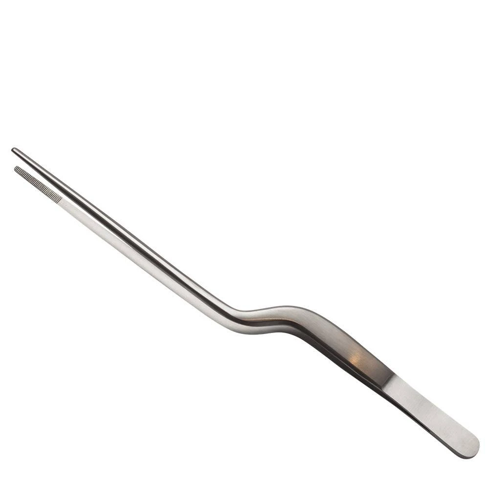 Dit pincet met handige dubbele knik is multifunctioneel. Gebruik het niet alleen om vlees te draaien in de pan maar ook om een presentatie op het bord te maken.