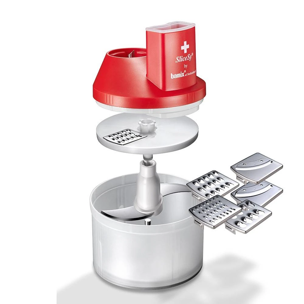 Met de SliceSy kunt u van uw Bamix een heuse keukenrobot maken. De SliceSy raspt, snijdt, hakt .... Geleverd met 5 genummerde raspen ( fijne medium grove julienne, fijne en grove schijfejes) en 1 hakmes. Werkt met de Deluxe en Swissline.