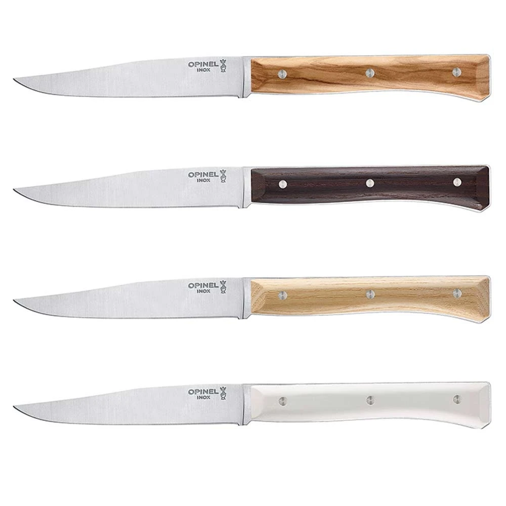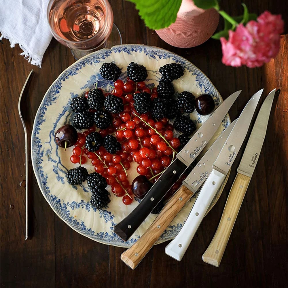Vier messen met een glad roestvrijstalen lemmet met volledige tang. Geen voedsel zal ze kunnen weerstaan! Vier handgrepen met verschillende houtsoorten en materialen: natuurlijk hout met es en olijfboom, een gestabiliseerd hout met donker essen en een VittEr®-eco-materiaal van geperst papier dat geschikt is voor de vaatwasser.